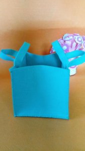 Az összes oldalt összevarrtam, kivéve a tetejét. Meggondoltam magam, szerintem egyszerűbb, ha nem kell nyitogatnia a kis lurkónak. Inkább füleket varrtam a két oldalára, mert az emelet és a földszint közt szokott az emberkéivel ingázni. A füleket kicsire varrtam, így ha összefogja őket, a tároló teteje eléggé összehajlik ahhoz, hogy ne essen ki belőle semmi. Íme az eredmény: